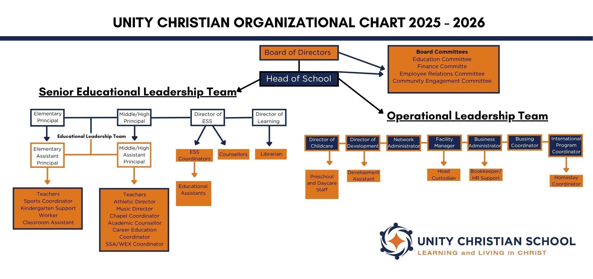 The board of the Chilliwack Christian School Society (Unity Christian School) consists of 9 persons elected by the Society. It then elects officers who serve as chair, vice chair, secretary, and various other standing committee functions.