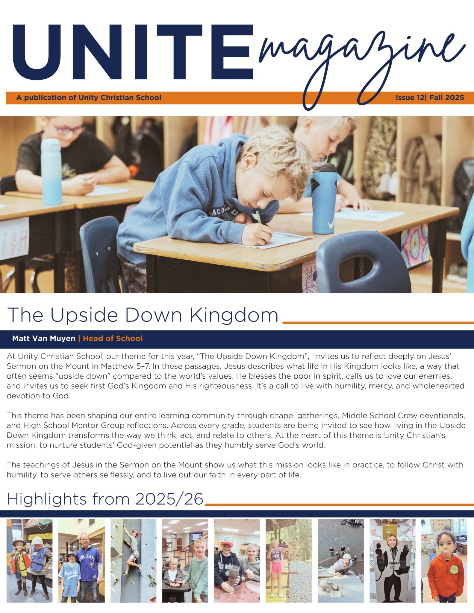 UNITE magazine is a key communication tool for our current families and our former families, grandparents, honorary members, alumni, and loyal supporters. UNITE magazine is committed to celebrating student learning and sharing ways we meet our mission to nurture students' God-given potential as they humbly serve God's world. We hope that UNITE magazine becomes a way for everyone to stay connected to the amazing Unity community. Enjoy the read!